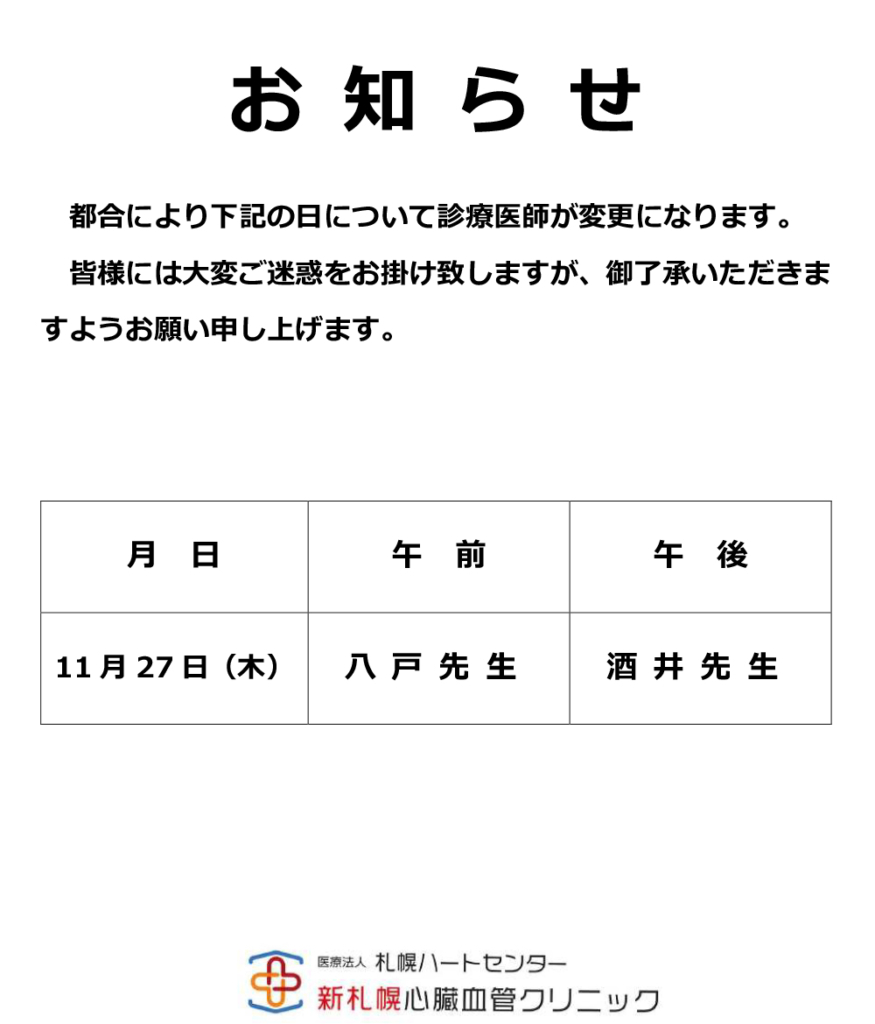 診療医師変更のお知らせ