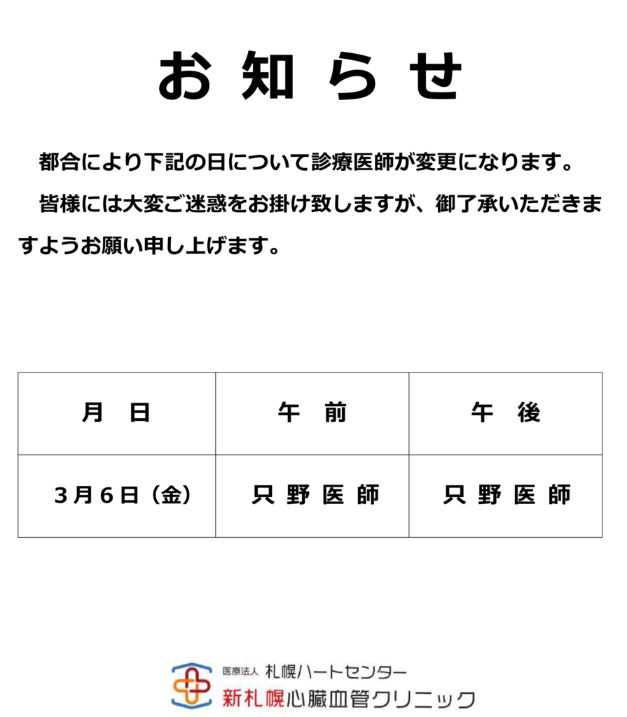 診療医師変更のお知らせ