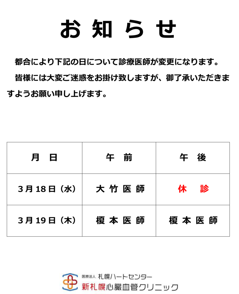 診療医師変更のお知らせ