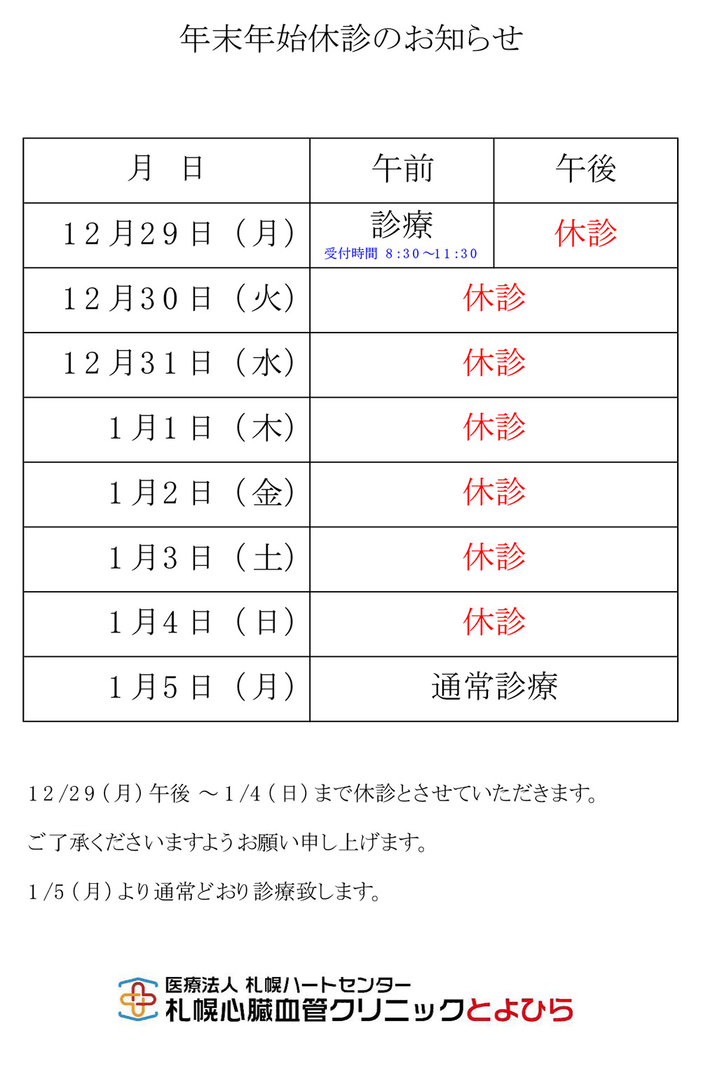 年末年始休診のお知らせ